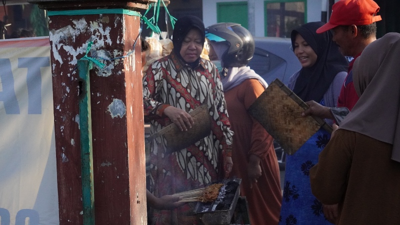 “Ya buka sampai siang, biar terus ramai,” ujarnya pada pedagang sate tersebut sambil tersenyum simpul.