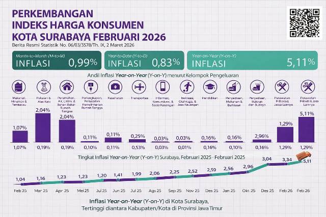 Inflasi Surabaya Februari 2026 Tembus 5,11 Persen, Merambat Naik Sejak 2025