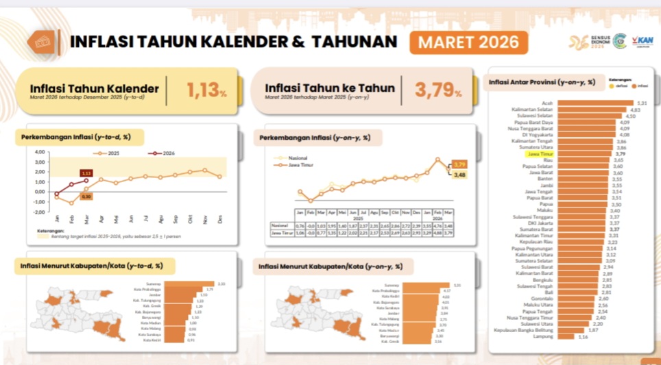 Surabaya, MercuryFM – Badan Pusat Statistik (BPS) mencatat inflasi Jawa Timur pada Maret 2026 tetap terkendali di tengah meningkatnya aktivitas konsumsi selama Ramadan dan menjelang Idulfitri 1447 Hijriah.