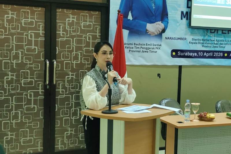 Surabaya, MercuryFM – Perempuan ternyata mendominasi dalam penggunaan media sosial ketimbang kalangan laki laki. Fakta ini diungkapkan Ketua Ketua Tim Penggerak PKK Jatim, Arumi Bachsin Emil Dardak, sebagai kynot speaker seminar “Peran Perempuan Dalam Mengakses dan Menyebarkan Informasi di Era Digital” yang diselenggarakan Pengurus Ikatan Keluarga Wartawan Indonesia (IKWI) Provinsi Jawa Timur, dalam rangka Hari Pers Nasional 2026 dan HUT PWI ke-80, yang berlangsung di Aula PWI Jatim, Jl Taman Apsari 15-17 Surabaya, Jumat (10/04/26).