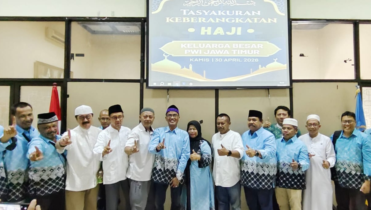 Acara tasyakuran pelepasan berlangsung khidmat di gedung Graha PWI Jawa Timur di Surabaya , Kamis (30/4/2026) . Rencananya, rombongan jemaah haji wartawan dan pengurus PWI Jawa Timur masuk gelombang pertama dan diberangkatkan tanggal 5 Mei 2026
